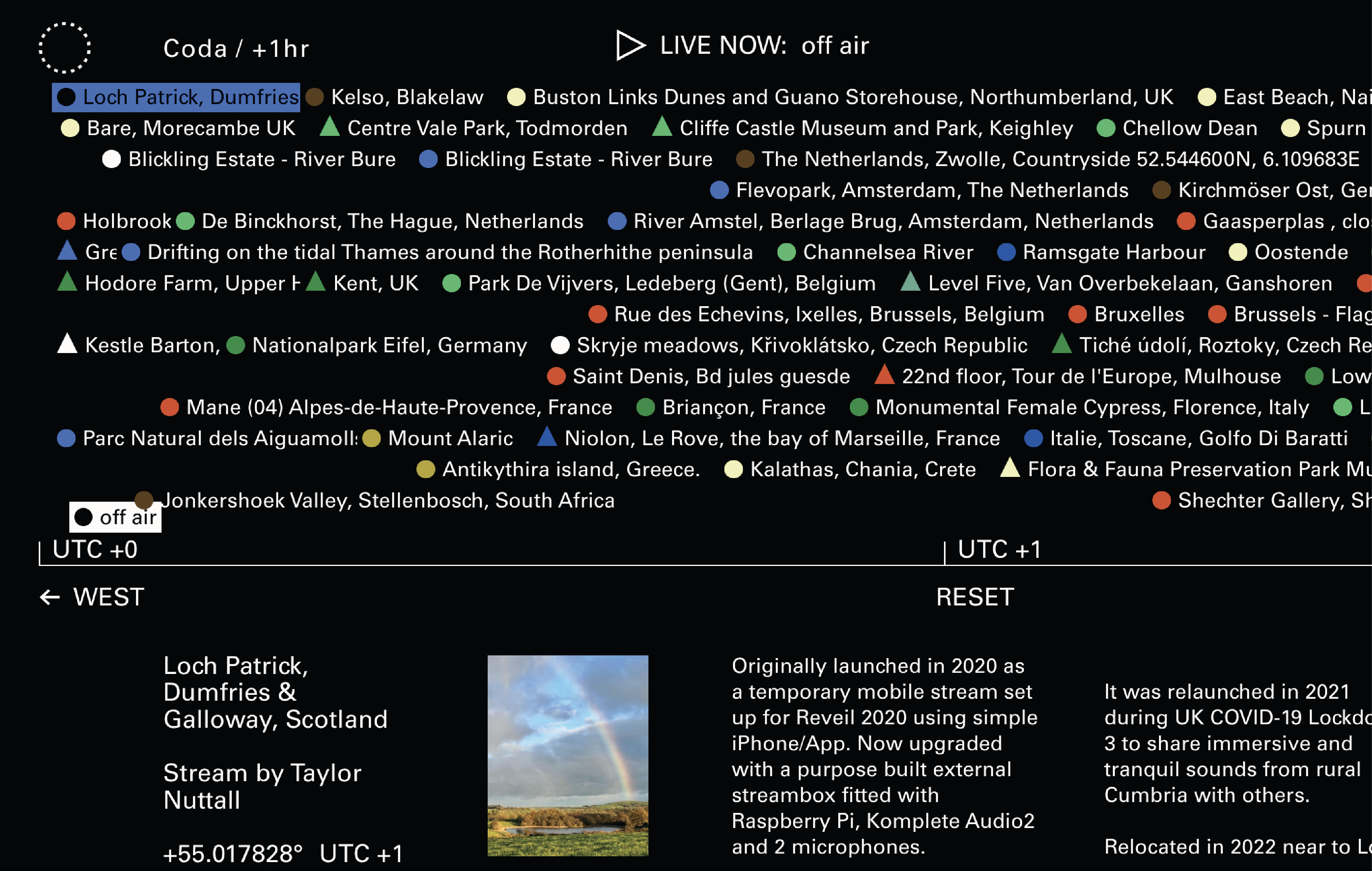Also run by Soundcamp, Reveil (2014—) is a collective production by streamers at listening points around the earth. The broadcast runs 24 hours, connecting streamers everywhere from various locations and situations.
