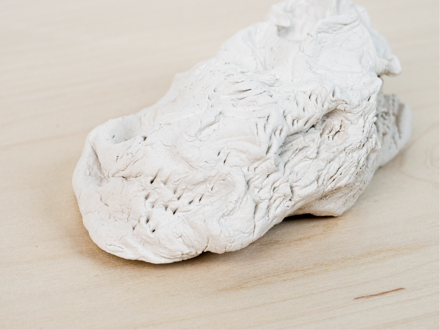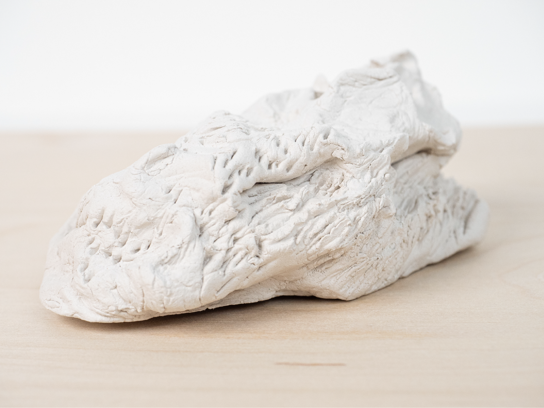 To begin, I responded directly to the sounds present in the recording — footsteps, mechanical noises, waves, winds. These elements prompted me to create creases and dents in the clay. Using my hands, I molded crevices into various parts of the clay, noticing I did this most intensely during the loud gusts of wind captured in the background. In fact, wind was the dominant sound throughout the walk — it was super heavy that day! This I expressed through more vigorous kneading. Sharp, unusual sounds like construction and mechanical noise became sharp line markings molded into the clay. The crashing waves of the sea stood out as well, so I also sculpted wave-like forms. The final result presented as something quite fluid and abstract; funnily resembling a coral reef.