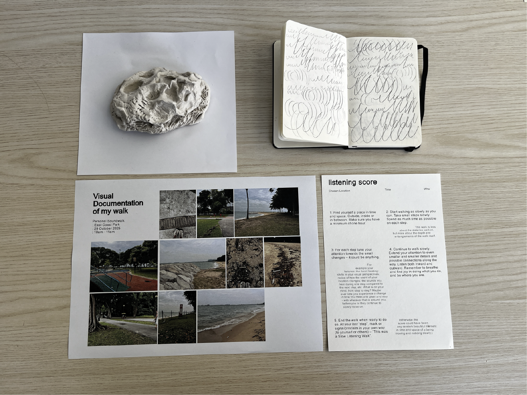 To conclude, I came back to school and decided to mould my personal response to the walk in clay. I chose clay as it was an easy material to shape with my hands, and I felt it was almost an extension of the body itself. Playing back the audio recording, I sat down and moulded the clay carefully. Eventually, an abstract clay sculpture emerged, representing my Sound Walk at East Coast Park.