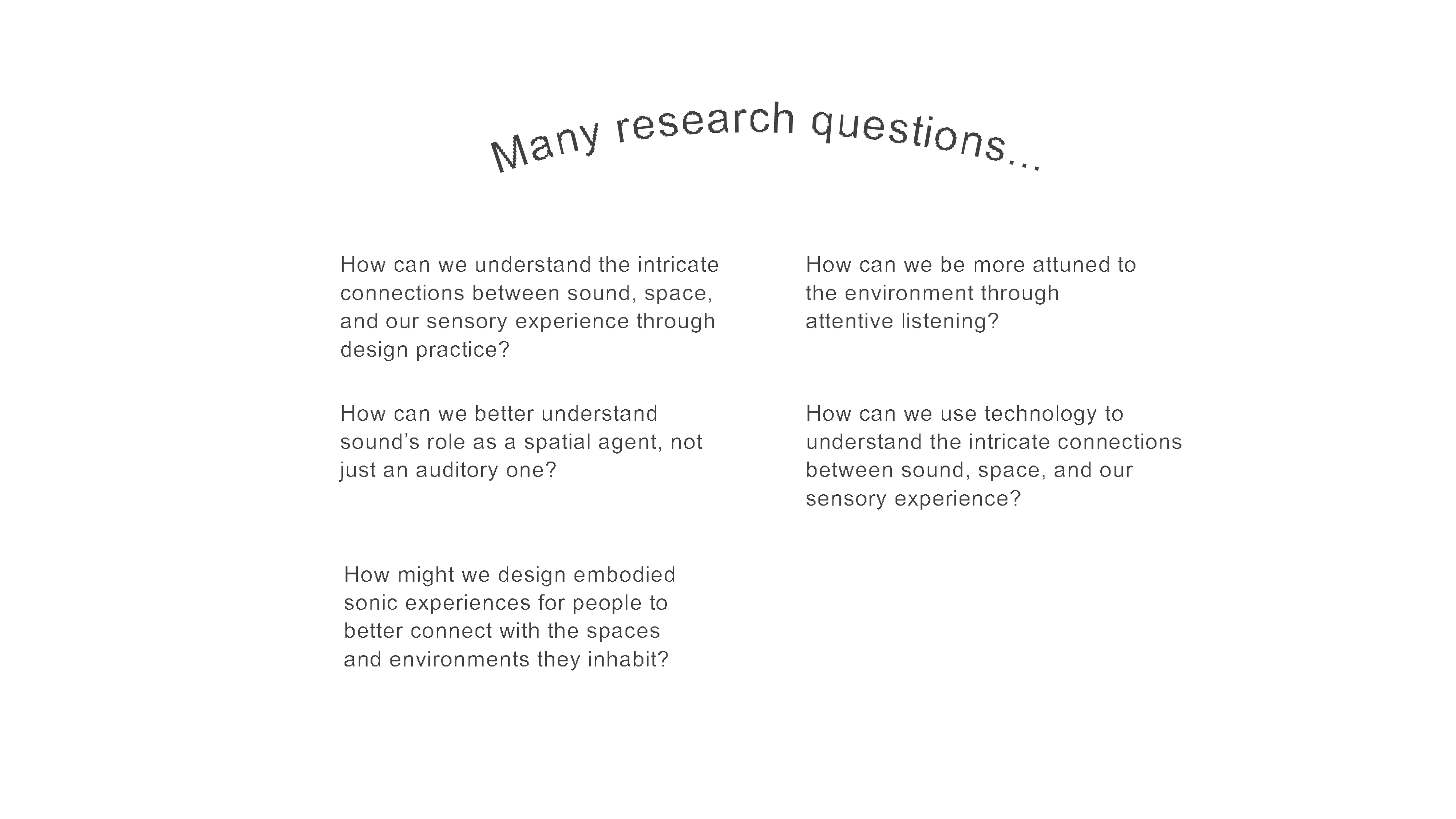 At the end of it all, I was reminded that I could make a lot of things. A product. A instrument. A installation. An experience. An exhibition. Through many rounds of iterations, testing, and feedback, it would help me define what I want to do. Andreas remarked that the field recordings and soundwalks functioned as field work, falling under the category of observations and ethnographic research. In using sound as a tool to connect ourselves to our surroundings, I would have to find a way to bring it back to my design practice as well. That I will think about in more detail in the weeks to come.