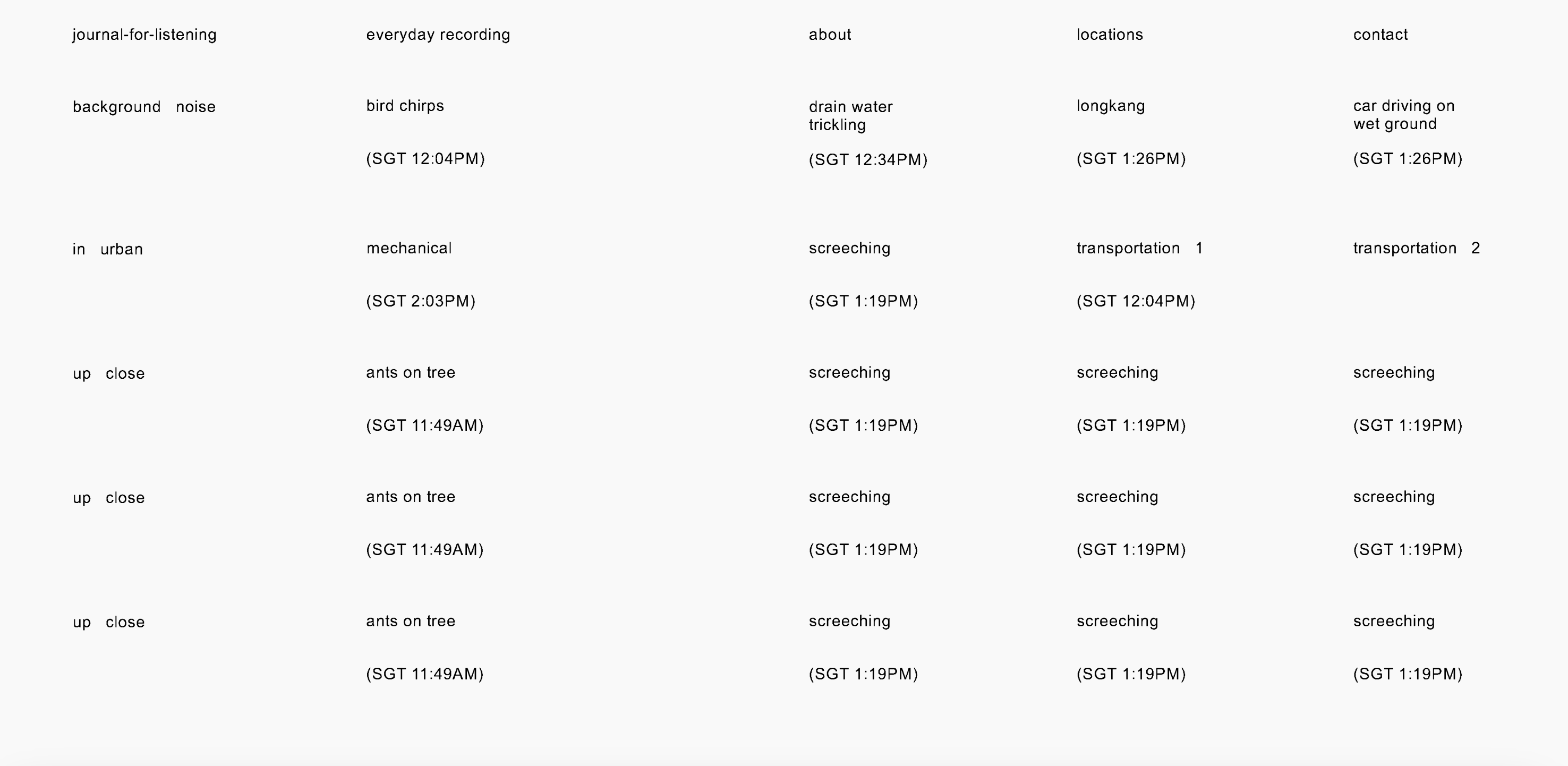 To document my field recordings, I decided to create a personal archive in website form. I’m not exactly sure about the layout of things yet, as I’m still recording things at my own pace – but for now, everything is “dumped” into columns on the site. Each recording is labelled and includes the time it was recorded. Clicking each titled recording will lead you to another page that plays the sound recorded, as well as a video (if available).
