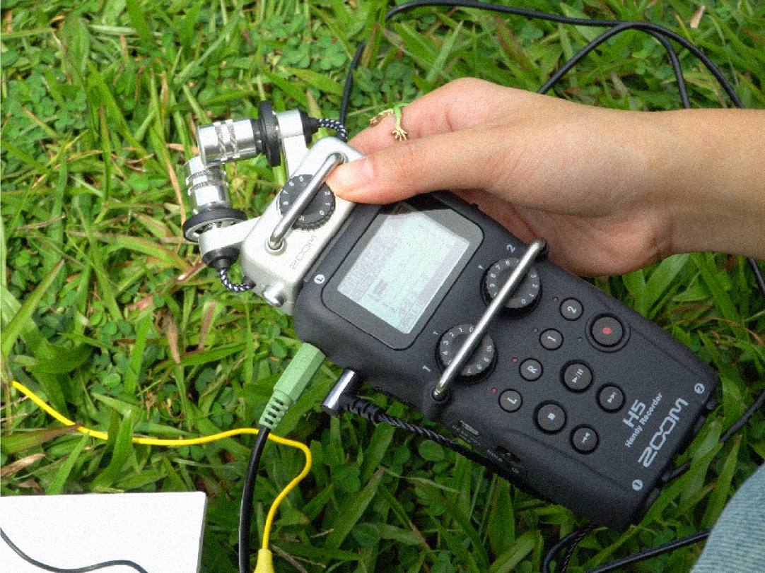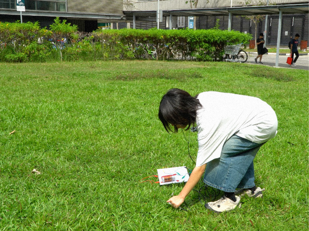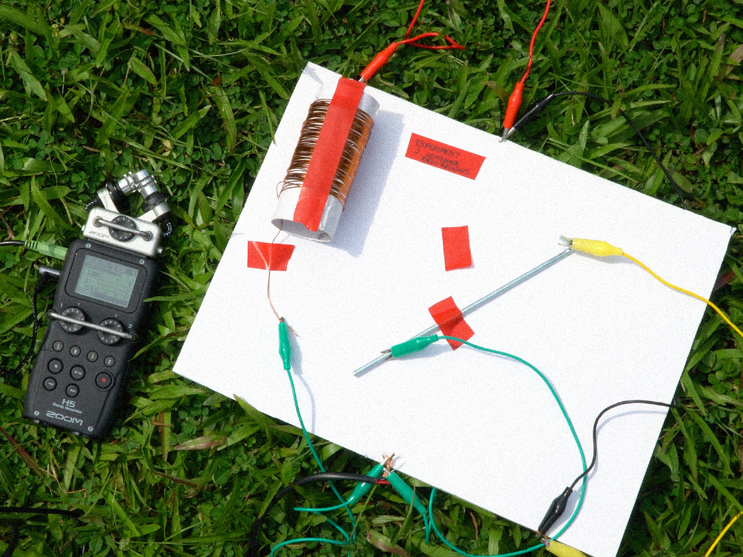 It was time for me to do some testing! I went down to the big grass patch below Lasalle and got to work poking my tent peg into the ground. For a DIY set up, it was relatively easy plugging it into my field recorder, though there were many wires I had to juggle. There wasn’t any specific reason as to why I chose the grass patch; it was the closest location and really wide, so I thought I might pick up some faint radio signals.