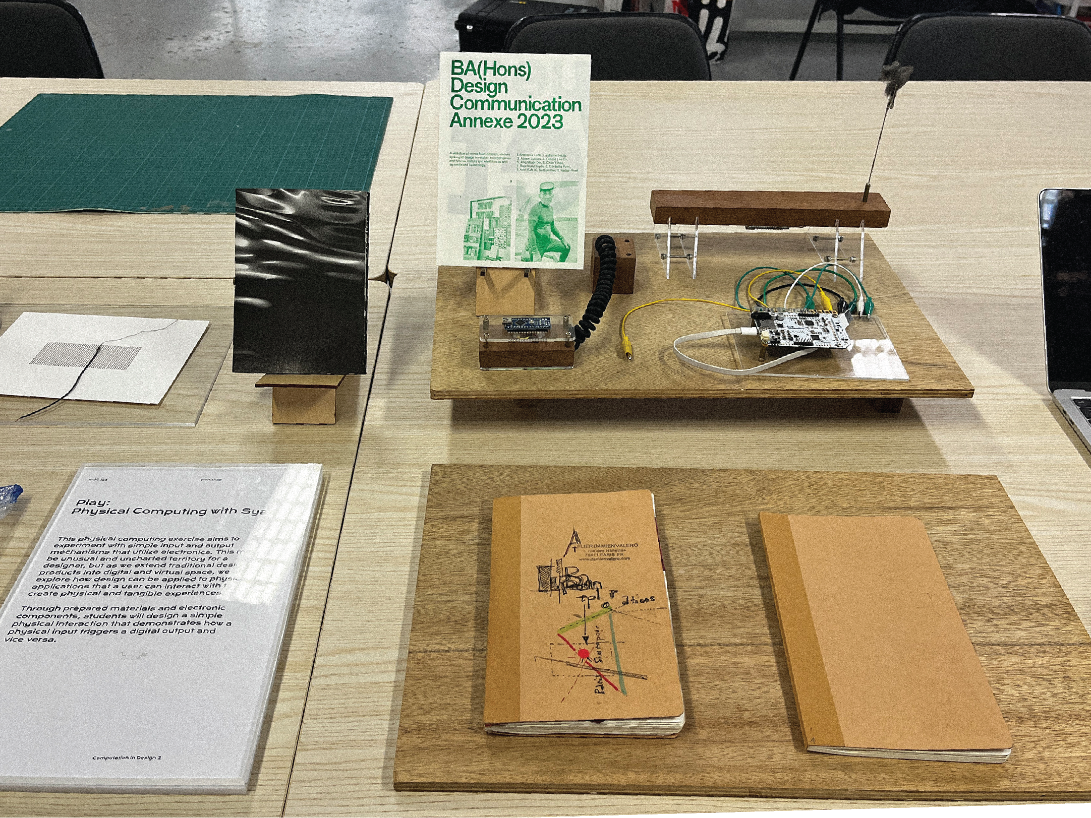 Layers are appreciated here – different works can be presented on wood boards or propped up on blocks. To show project writeups, using an acrylic board makes everything look more presentable and neat.
