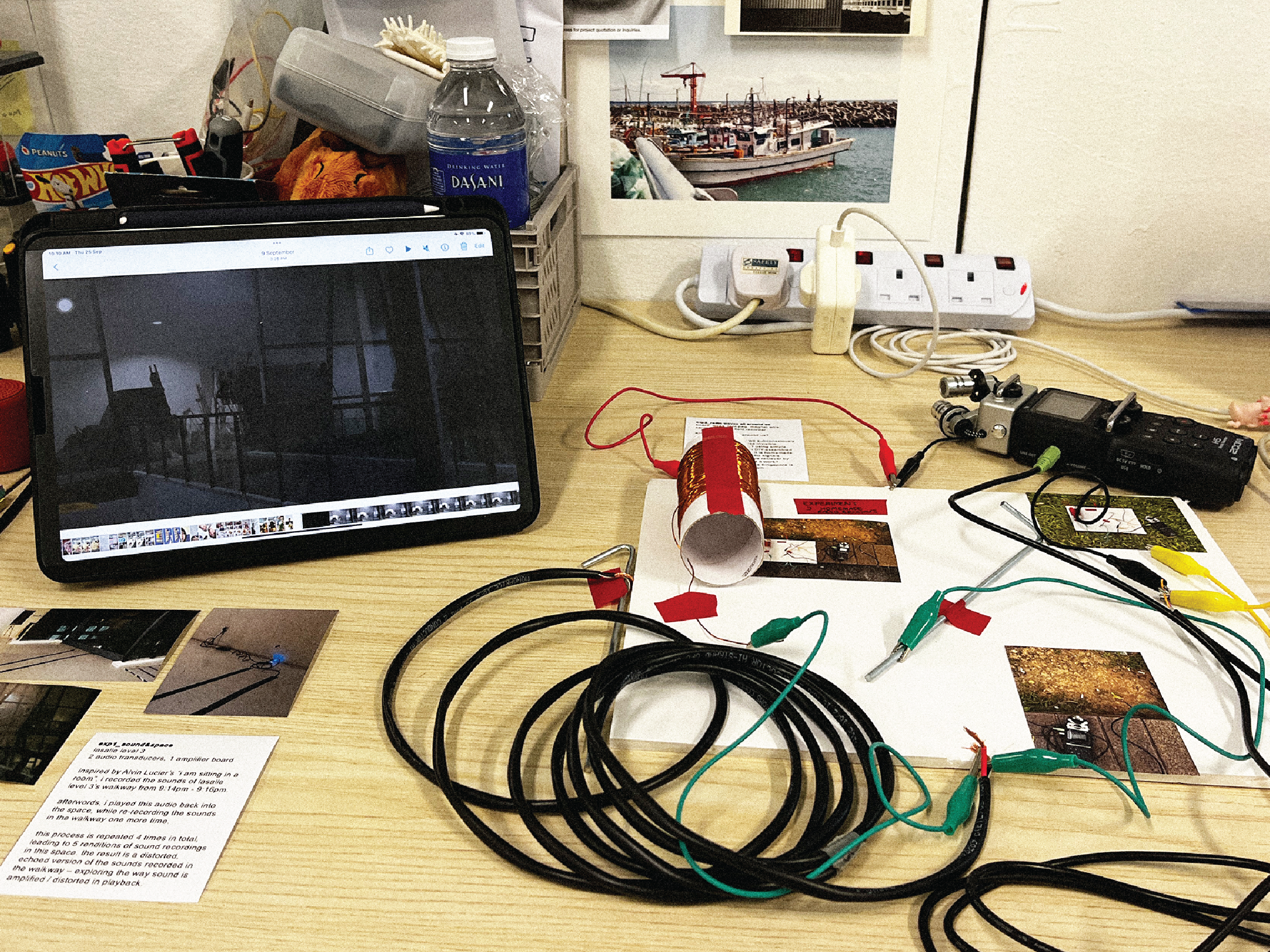 Today we had a little set-up session with all the experiments we did thus far - in preparation for a formative presentation next week. To start off, Andreas showed us a set up of works on the table, neatly arranged in sections.