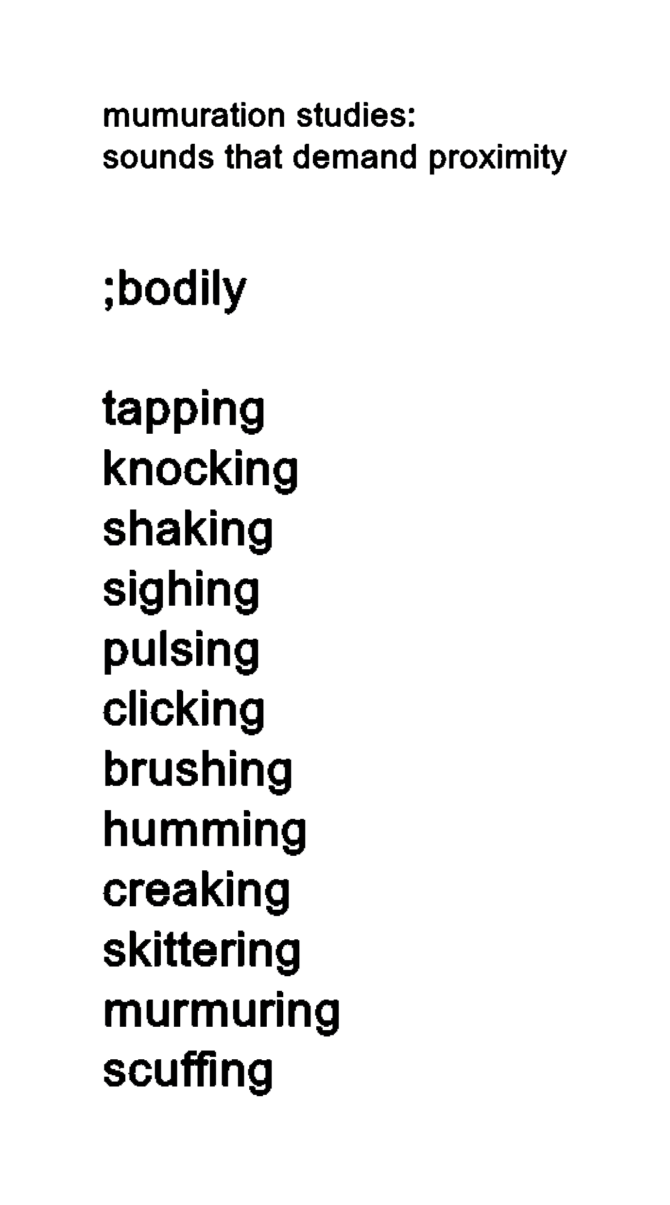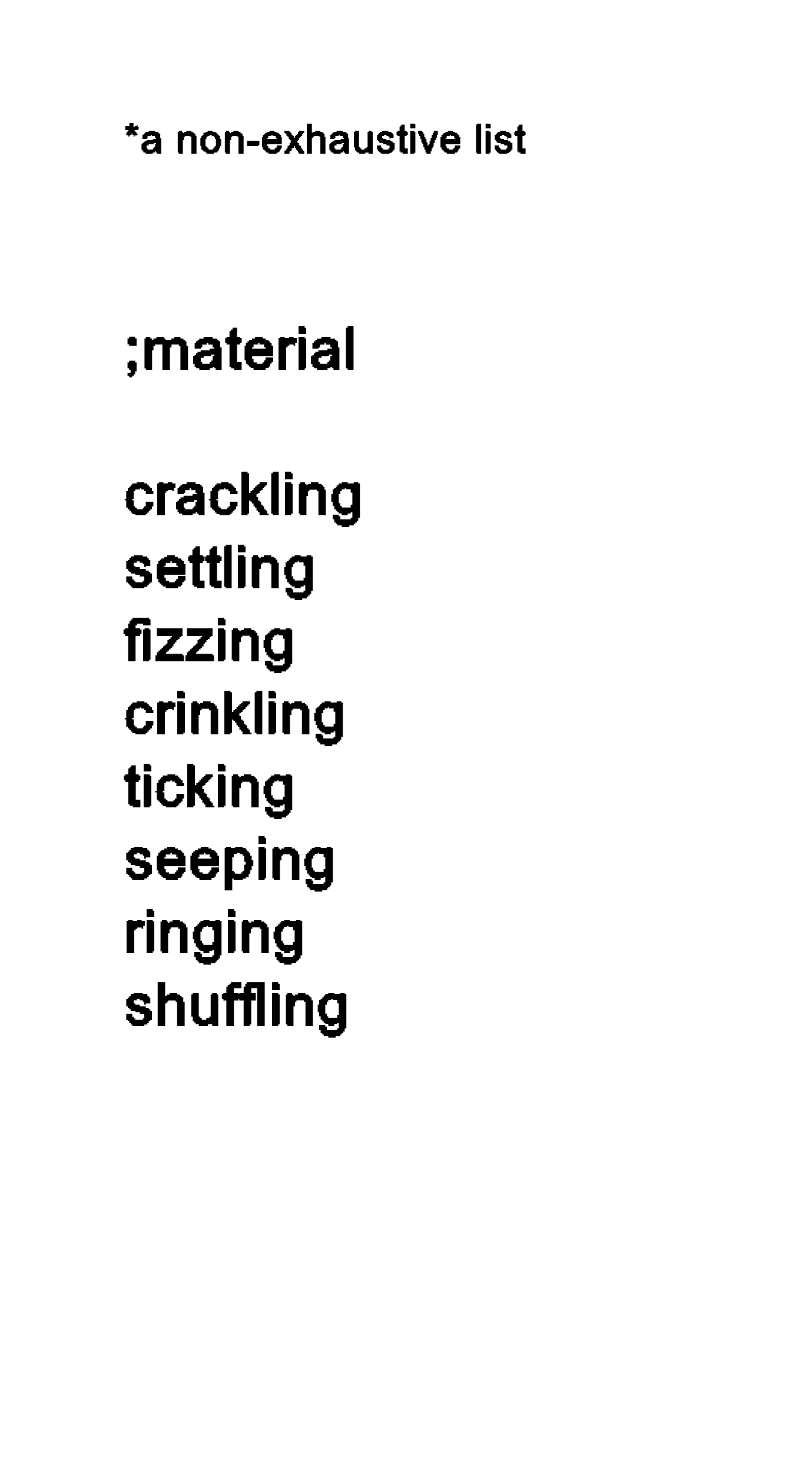 I began by listing verbs associated with these smaller sounds – actions both subtle and direct that produce quiet sounds we often overlook in daily life.