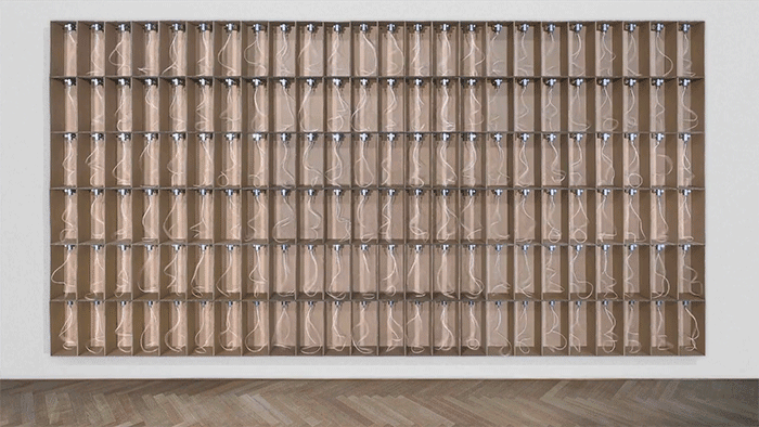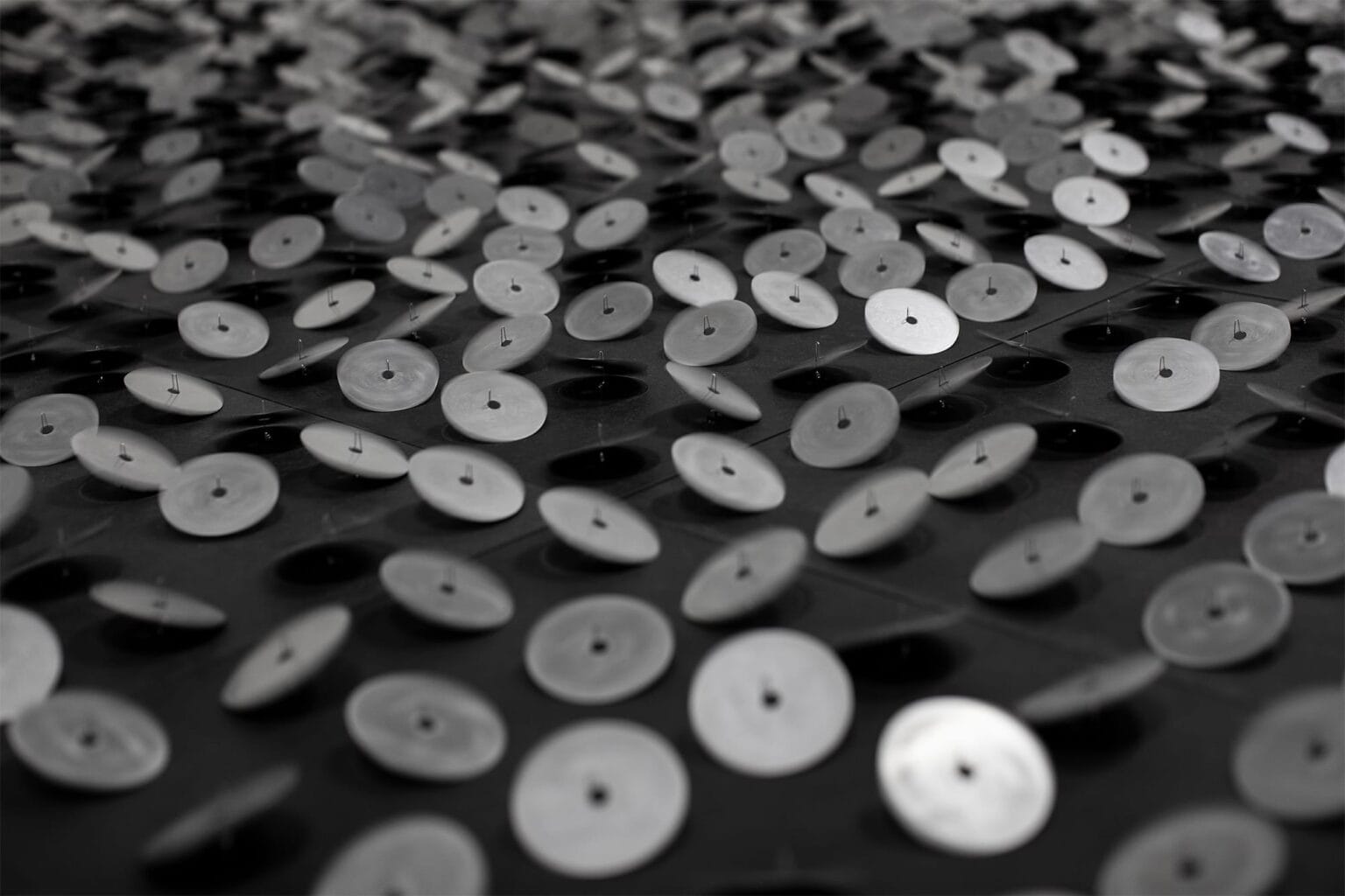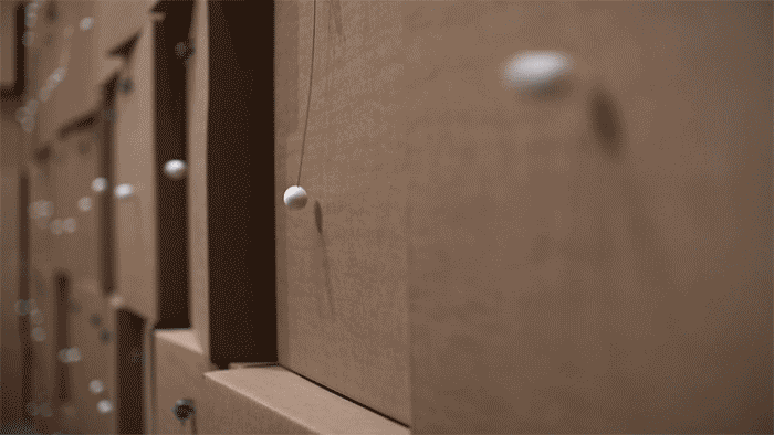Swiss Sound artist Zimoun's large-scale installations and kinetic sculptures demand attention through various configurations comprising of simple, everyday objects. For example, sticks and foam balls attached to a wire; small ball chains and metal discs. The sound is produced simply by motorizing one portion with a motor, causing them to shake and shuffle back and forth. With multiple of these structures, the subtle sound becomes a loud force – demanding attention from the listener.